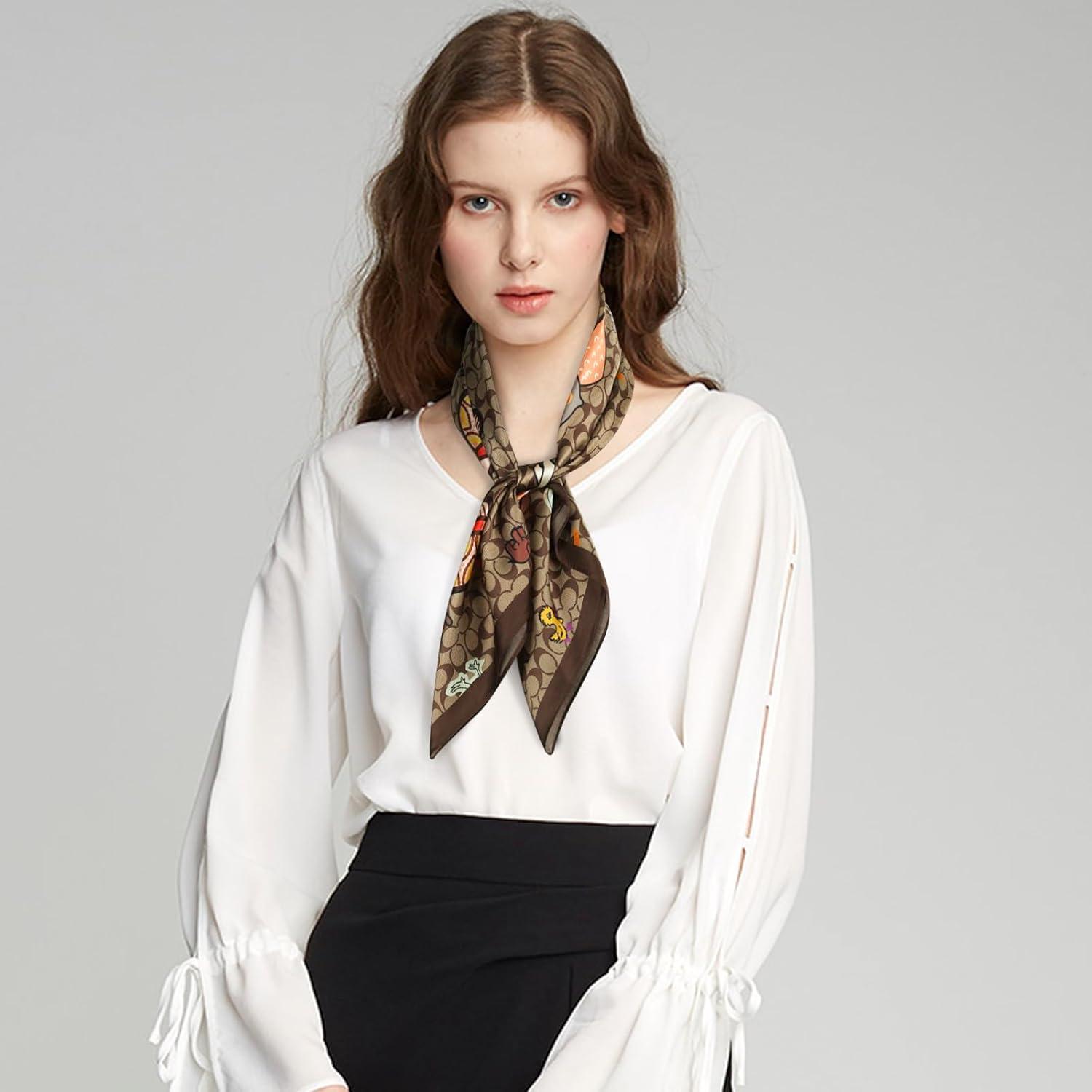 EXTREE 100% Pure Mulberry Silk Scarf Fashion Hair for Women Scarf Lightweight Square Neckerchief 27.5× 27.5 inches(Chain Brown)