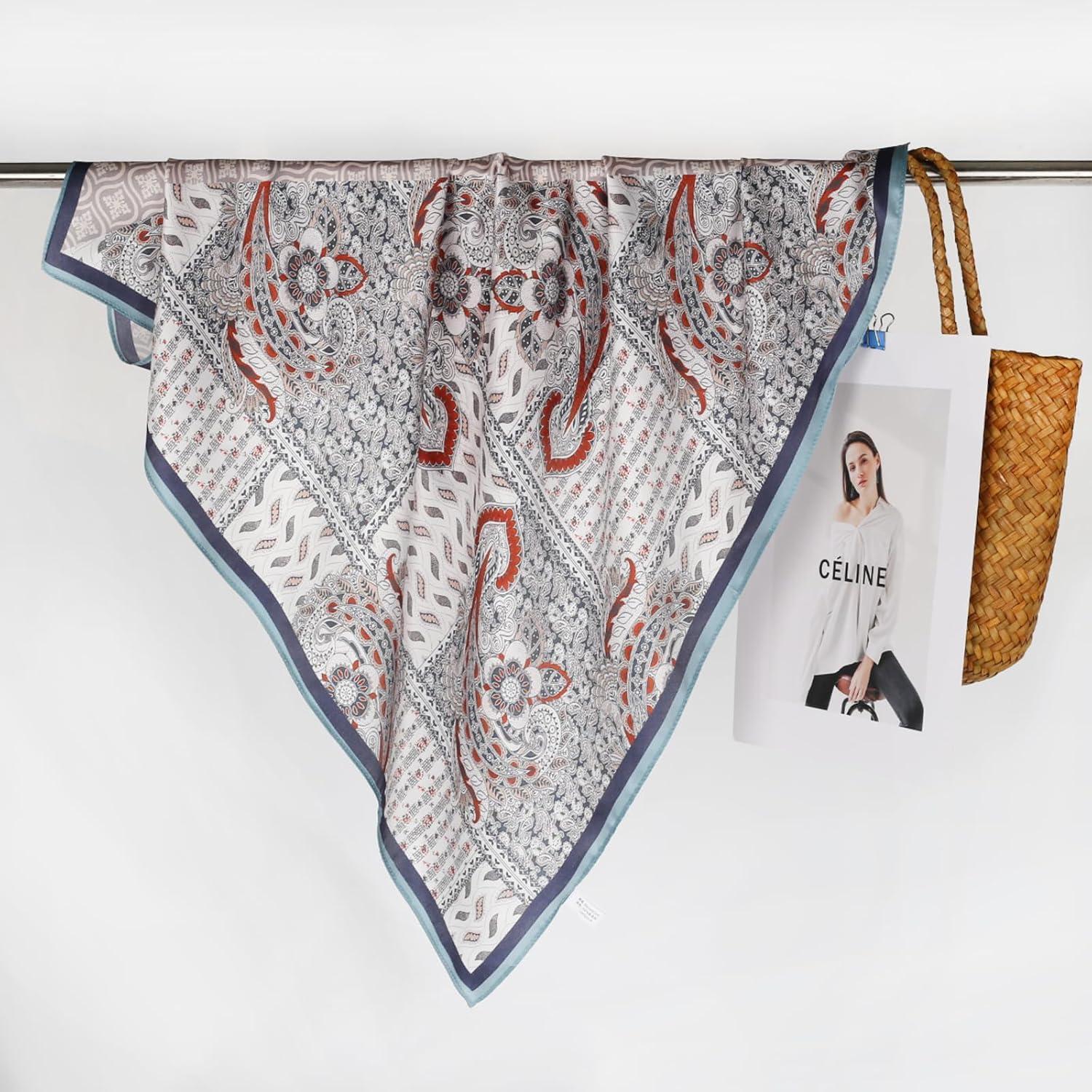 EXTREE 100% Pure Mulberry Silk Scarf Fashion Hair for Women Scarf Lightweight Square Neckerchief 27.5× 27.5 inches(Gray Stitching Totem)