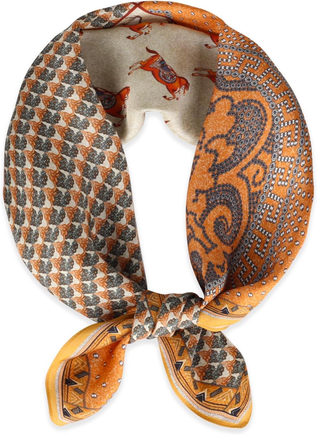 EXTREE 100% Pure Mulberry Silk Scarf Fashion Hair for Women Scarf Lightweight Square Neckerchief 27.5× 27.5 inches(Orange Brown and Beige Horse Racing Totem)