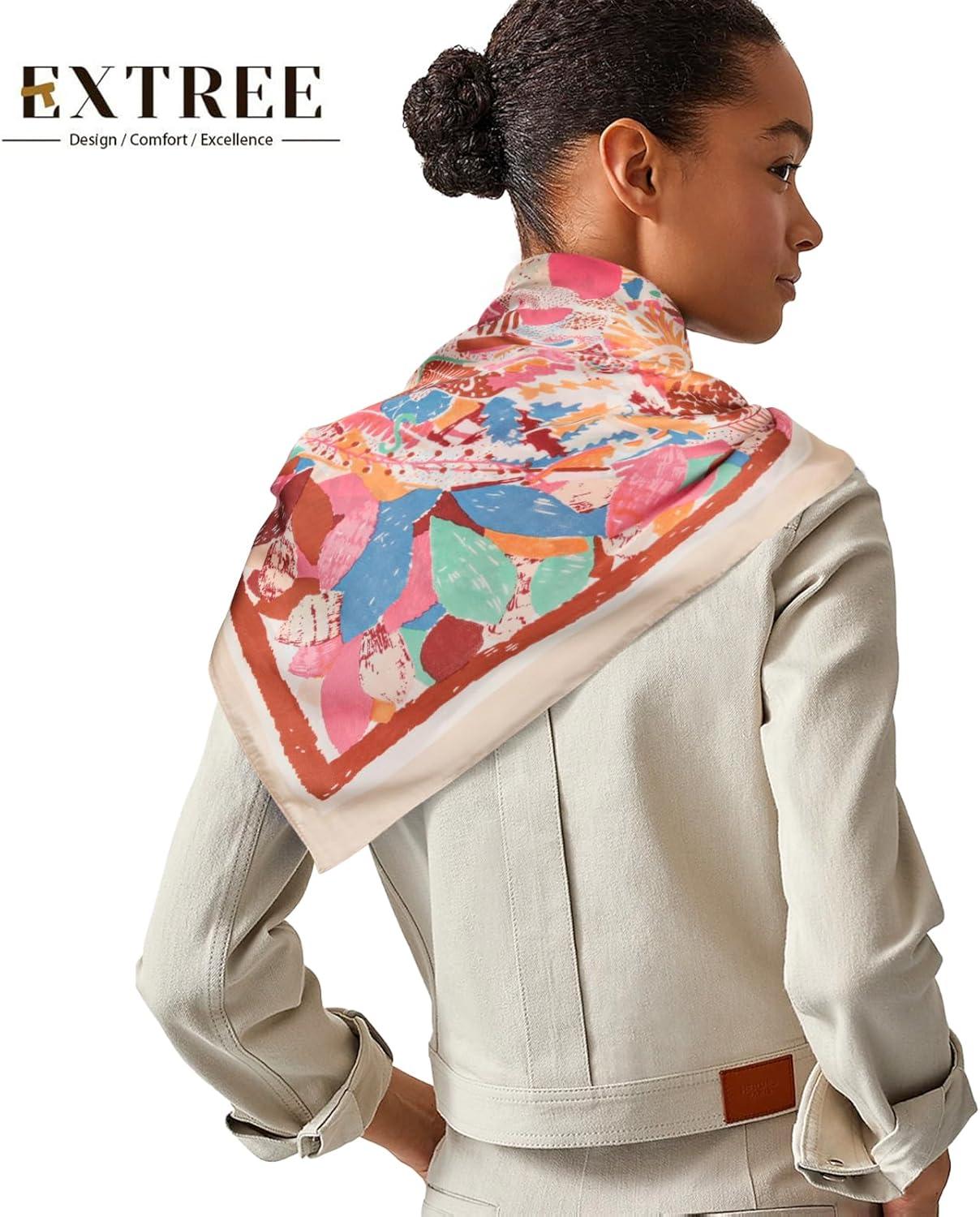EXTREE Fashion Silky Satin Headscarf for Women Girls: Exquisite Pattern Lightweight Silk Graceful Scarfs 27.5 x 27.5 inches(A Graffiti Red Flower Pink)