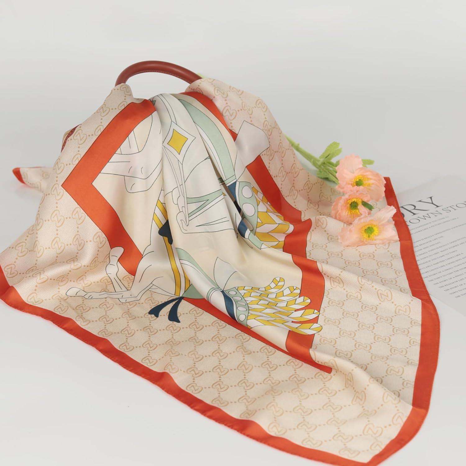 EXTREE Fashion Silky Satin Headscarf for Women Girls: Exquisite Pattern Lightweight Silk Graceful Scarfs 27.5 x 27.5 inches(Beige Horse Orange Edge)