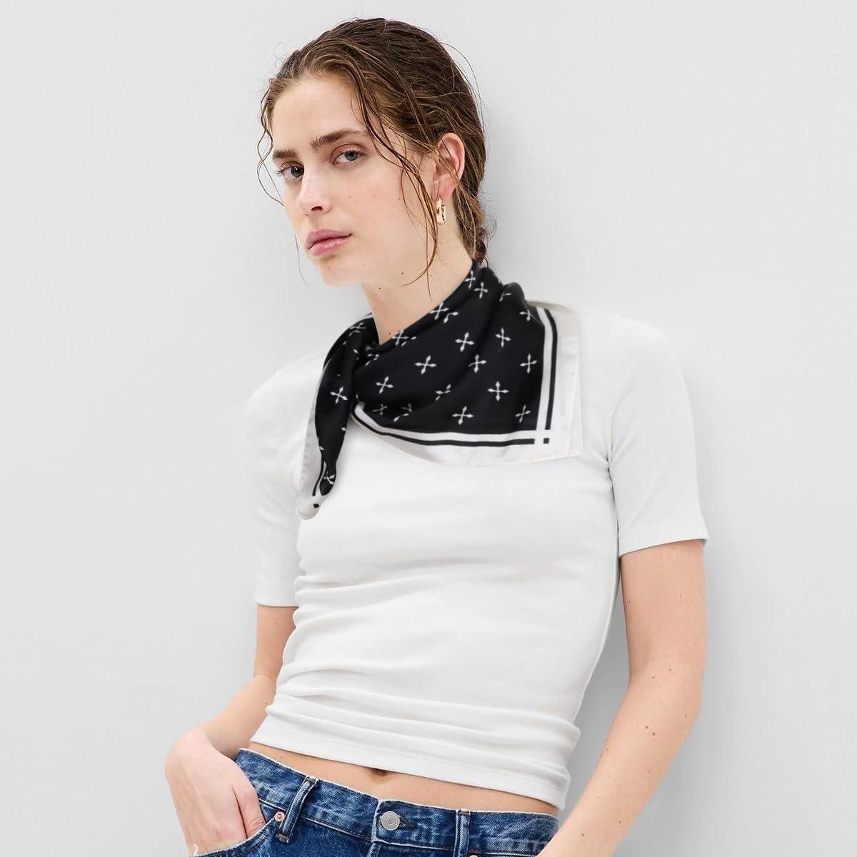 EXTREE Fashion Silky Satin Headscarf for Women Girls: Exquisite Pattern Lightweight Silk Graceful Scarfs 27.5 x 27.5 inches(Cross Arrow Black)