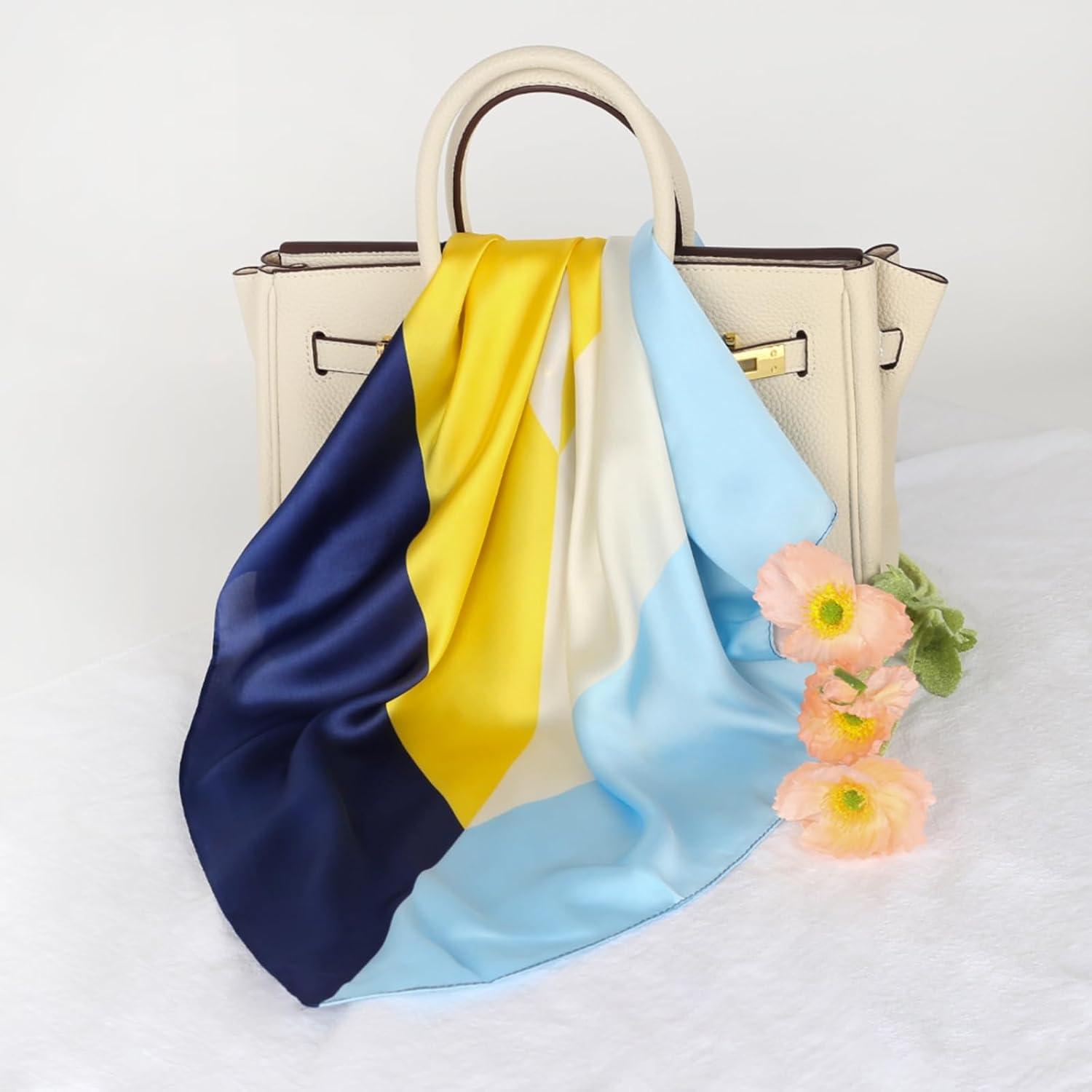 EXTREE Fashion Silky Satin Headscarf for Women Girls: Exquisite Pattern Lightweight Silk Graceful Scarfs 27.5 x 27.5 inches(Diagonal Diamond Blue and Yellow)