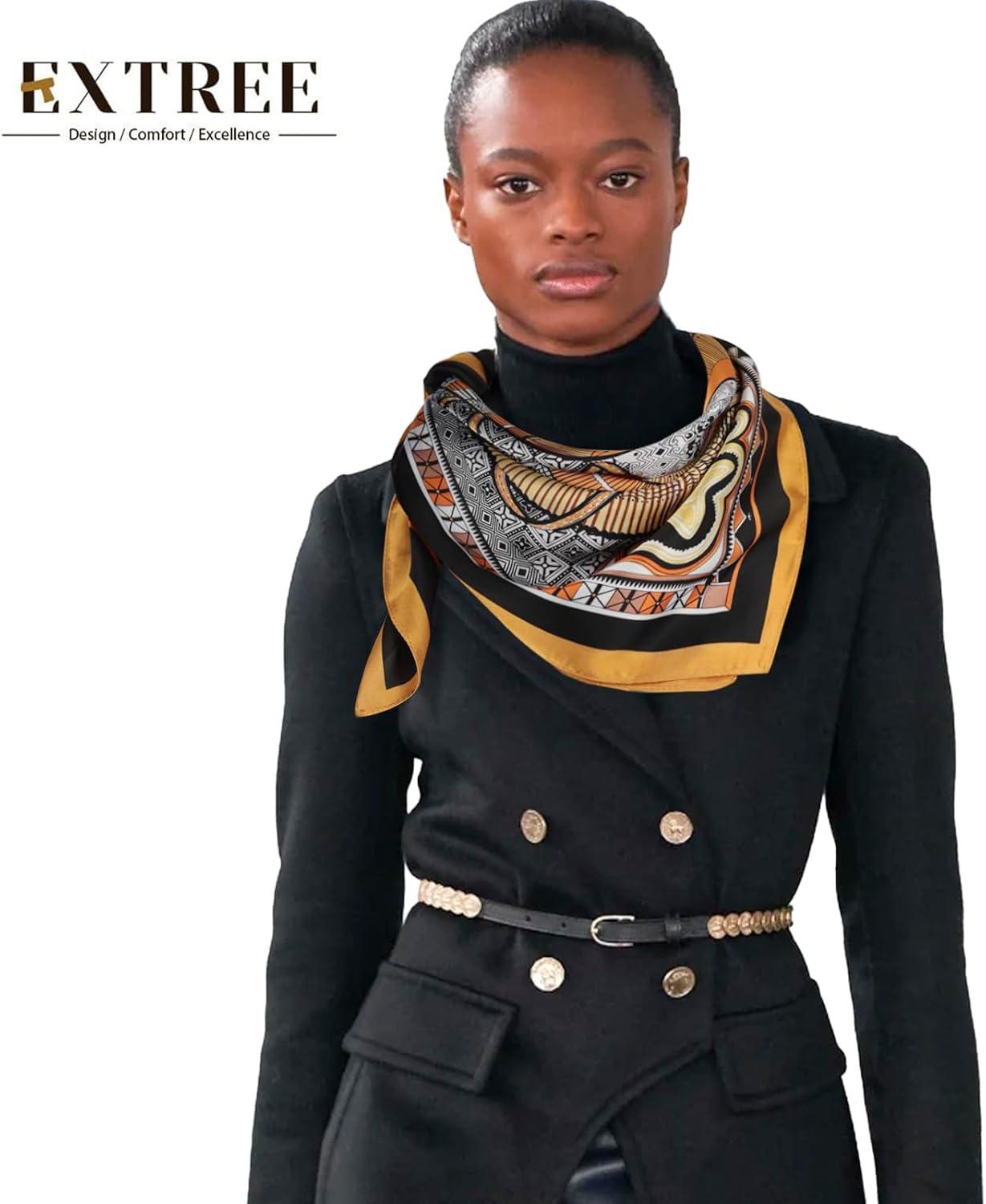 EXTREE Fashion Silky Satin Headscarf for Women Girls: Exquisite Pattern Lightweight Silk Graceful Scarfs 27.5 x 27.5 inches(Geometric Frame Skirt Yellow)