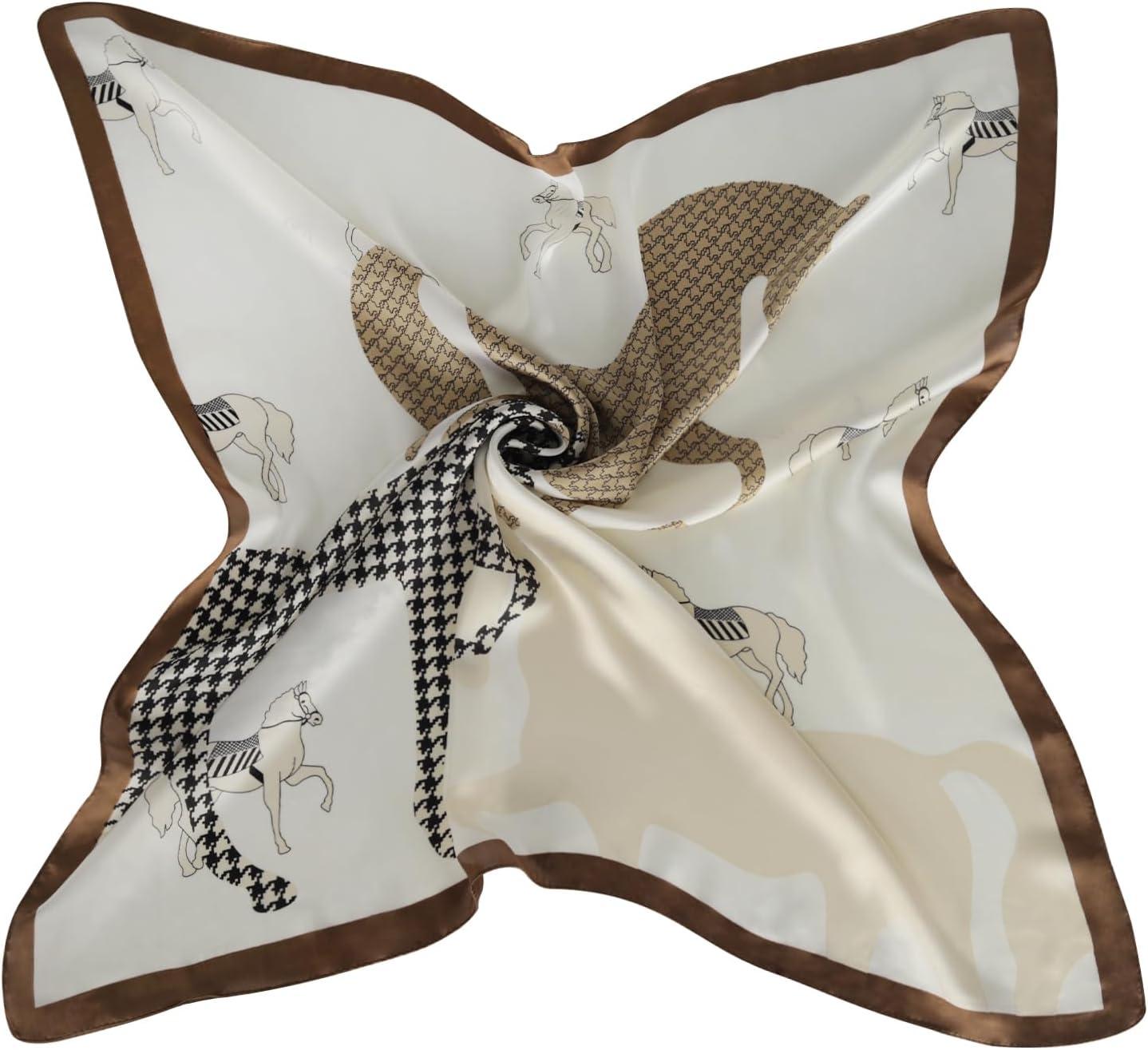 EXTREE Fashion Silky Satin Headscarf for Women Girls: Exquisite Pattern Lightweight Silk Graceful Scarfs 27.5 x 27.5 inches(Khaki White Horse)