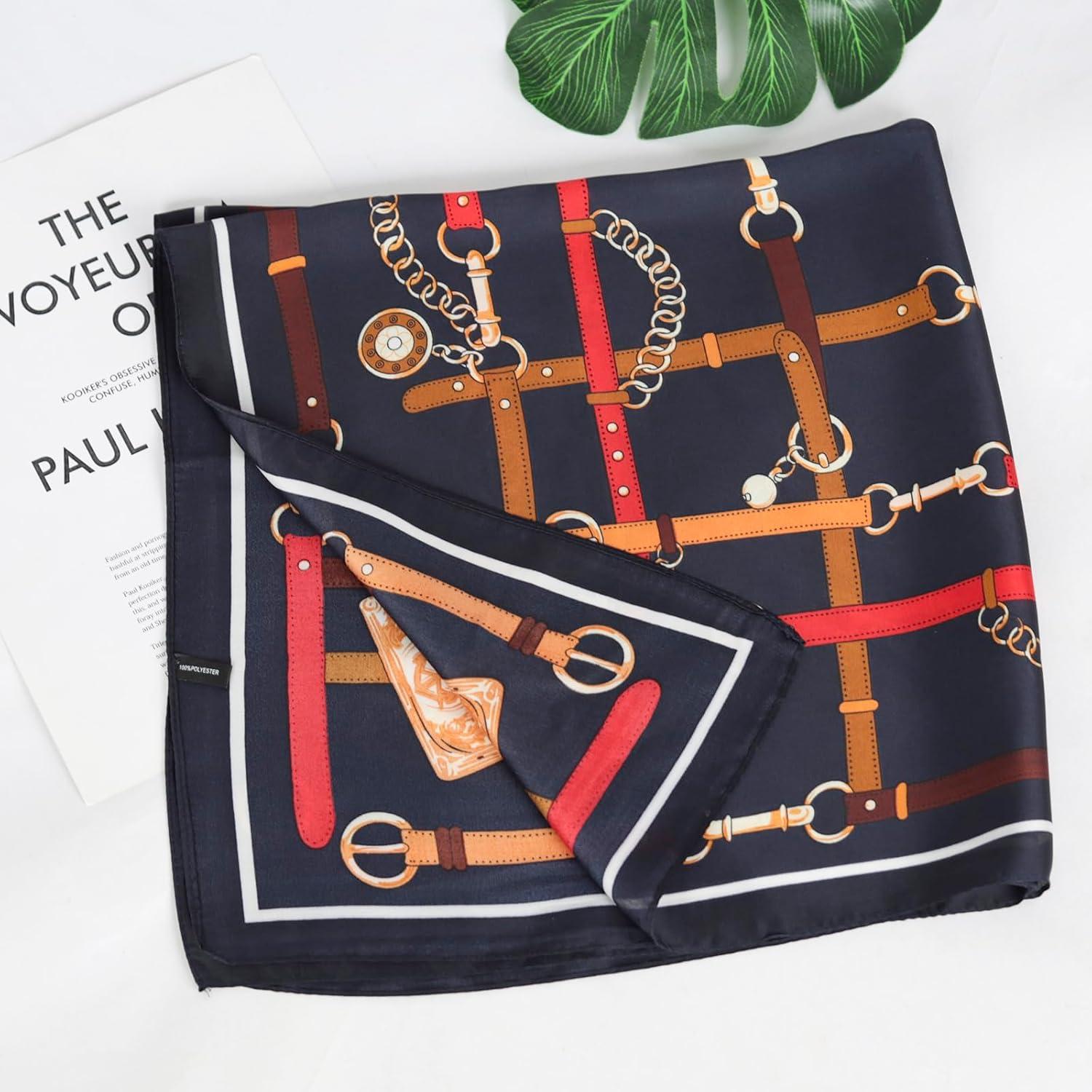 EXTREE Fashion Silky Satin Headscarf for Women Girls: Exquisite Pattern Lightweight Silk Graceful Scarfs 27.5 x 27.5 inches(Navy Blue Belt)