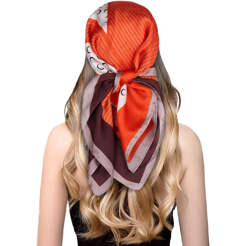 EXTREE Fashion Silky Satin Headscarf for Women Girls: Exquisite Pattern Lightweight Silk Graceful Scarfs 27.5 x 27.5 inches(Orange Iron Buckle)