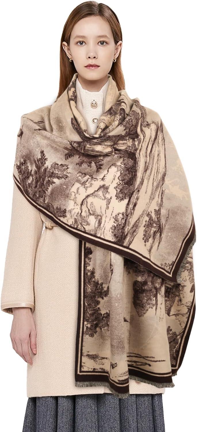 EXTREE Scarfs for Women Pashmina Silky Shawl Wrap for Evening Dressing Blanket Open Front Poncho Cape(Agi-khaki-paint)