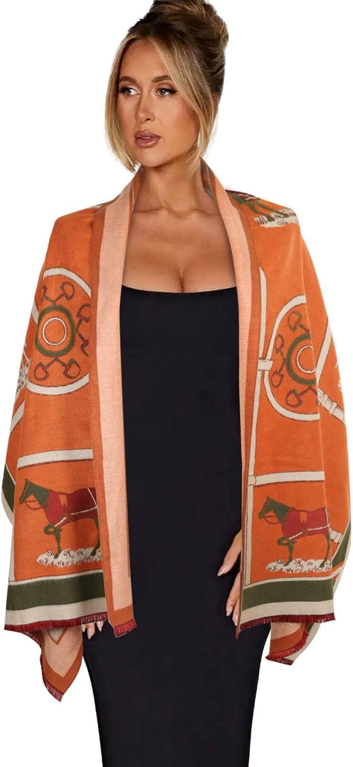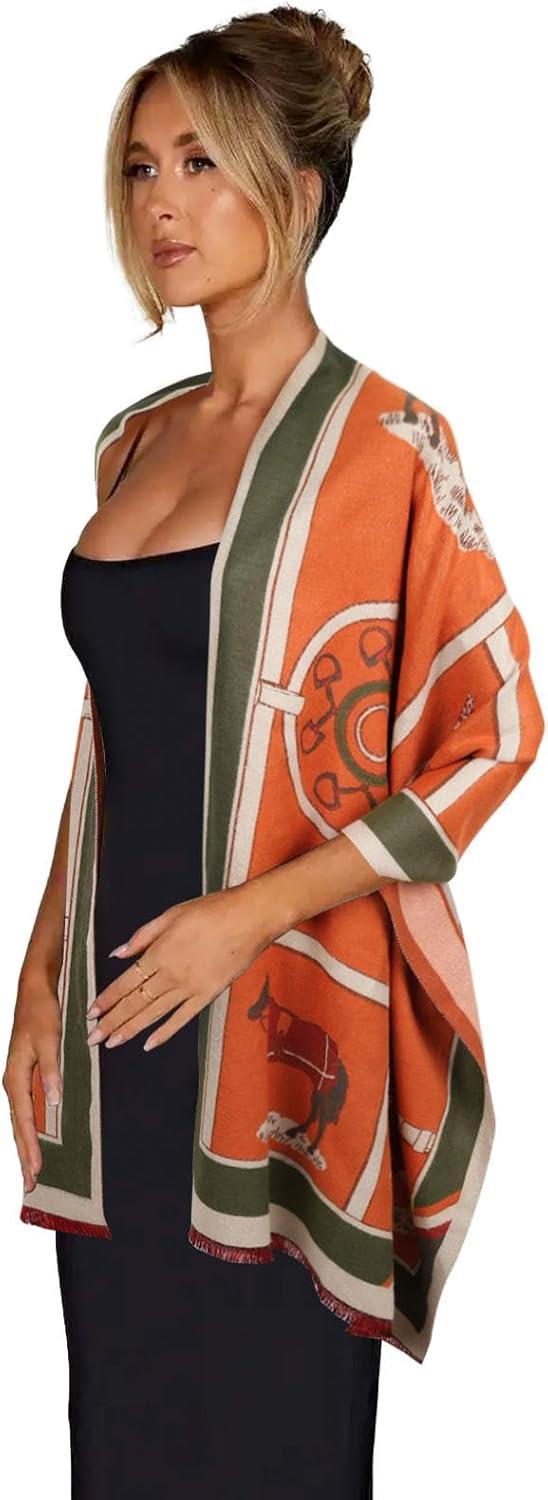 EXTREE Scarfs for Women Pashmina Silky Shawl Wrap for Evening Dressing Blanket Open Front Poncho Cape(Agx-pink+orange-horse)