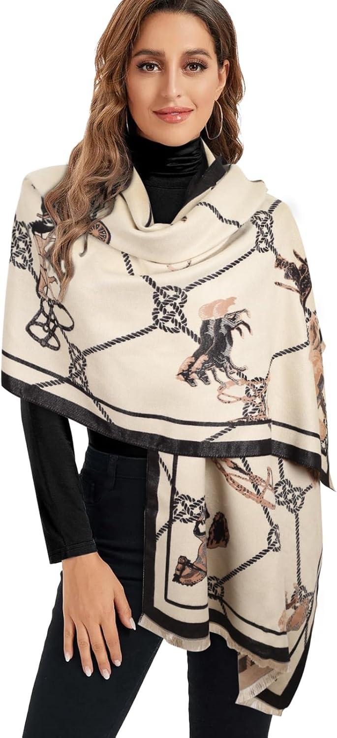 EXTREE Scarfs for Women Pashmina Silky Shawl Wrap for Evening Dressing Blanket Open Front Poncho Cape(Aid-beige-horse)