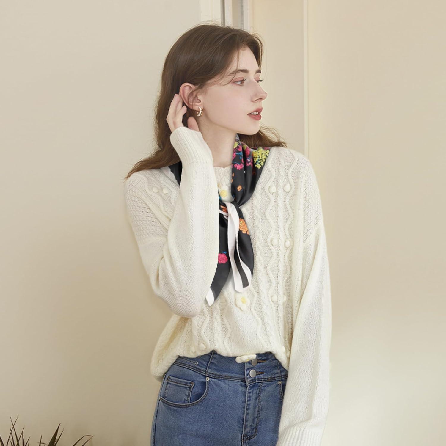 EXTREE Silk Feeling Scarf Medium Square Satin Head Scarf Sleeping Hair Wrapping for Women 27.5 × 27.5 inches(Light Floral Dress)