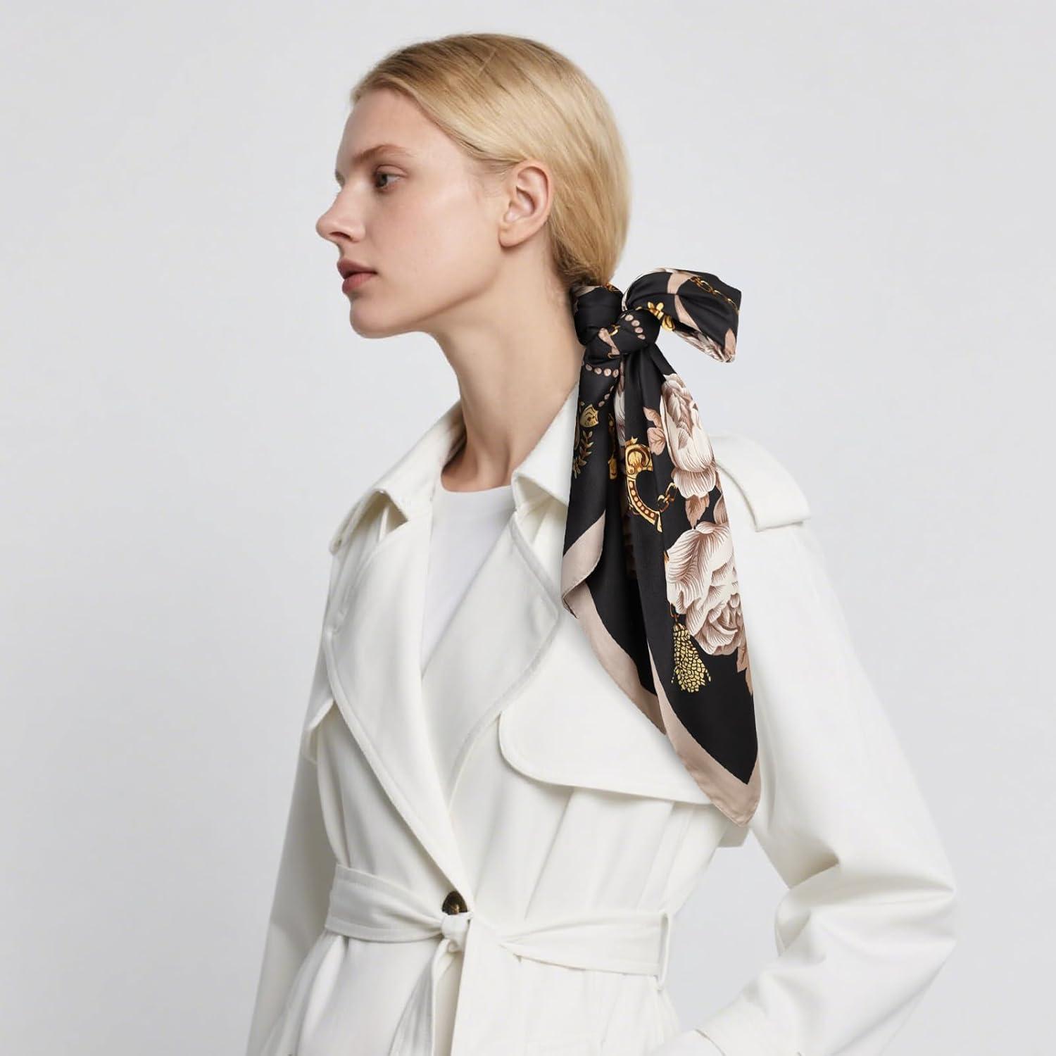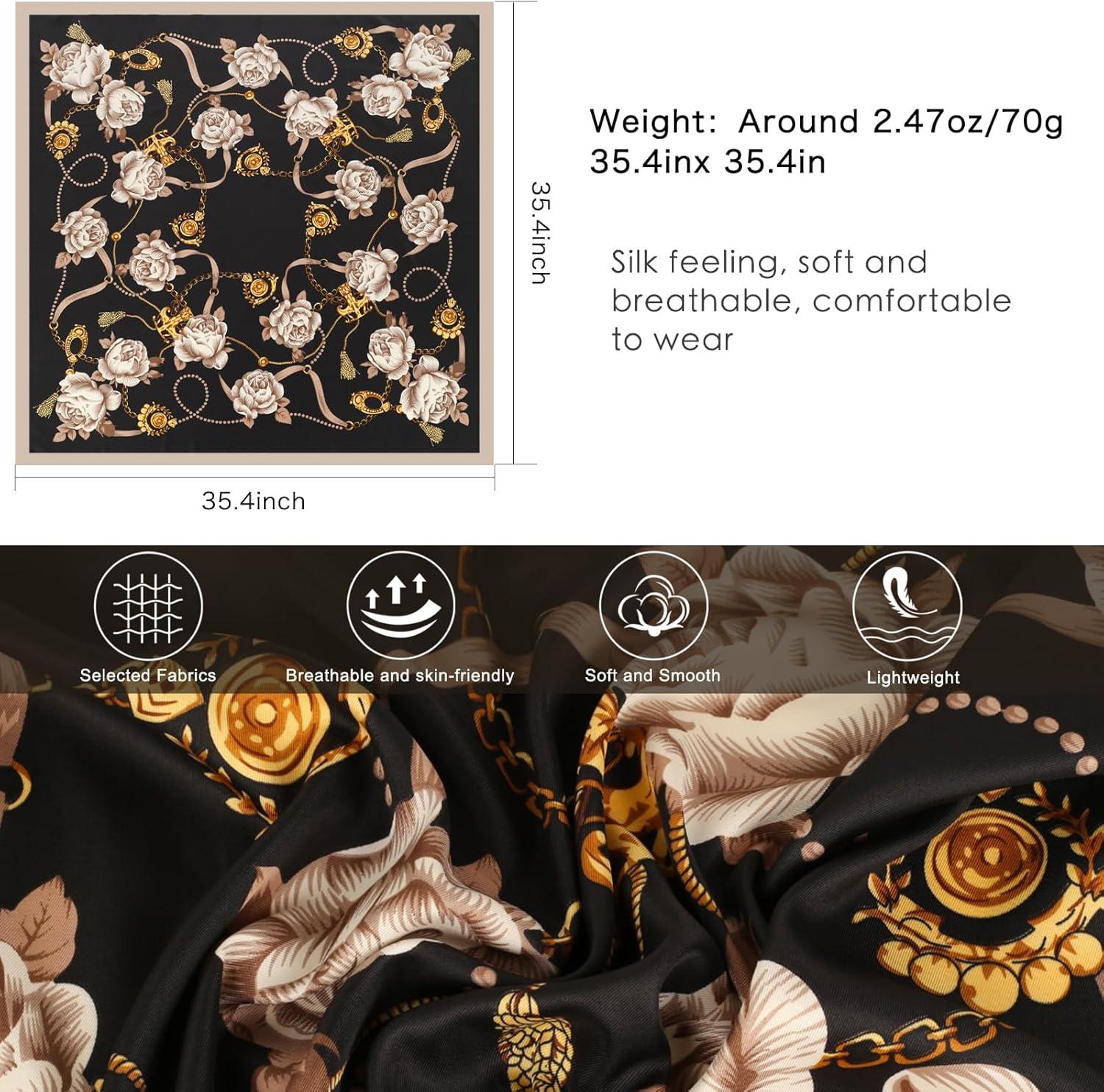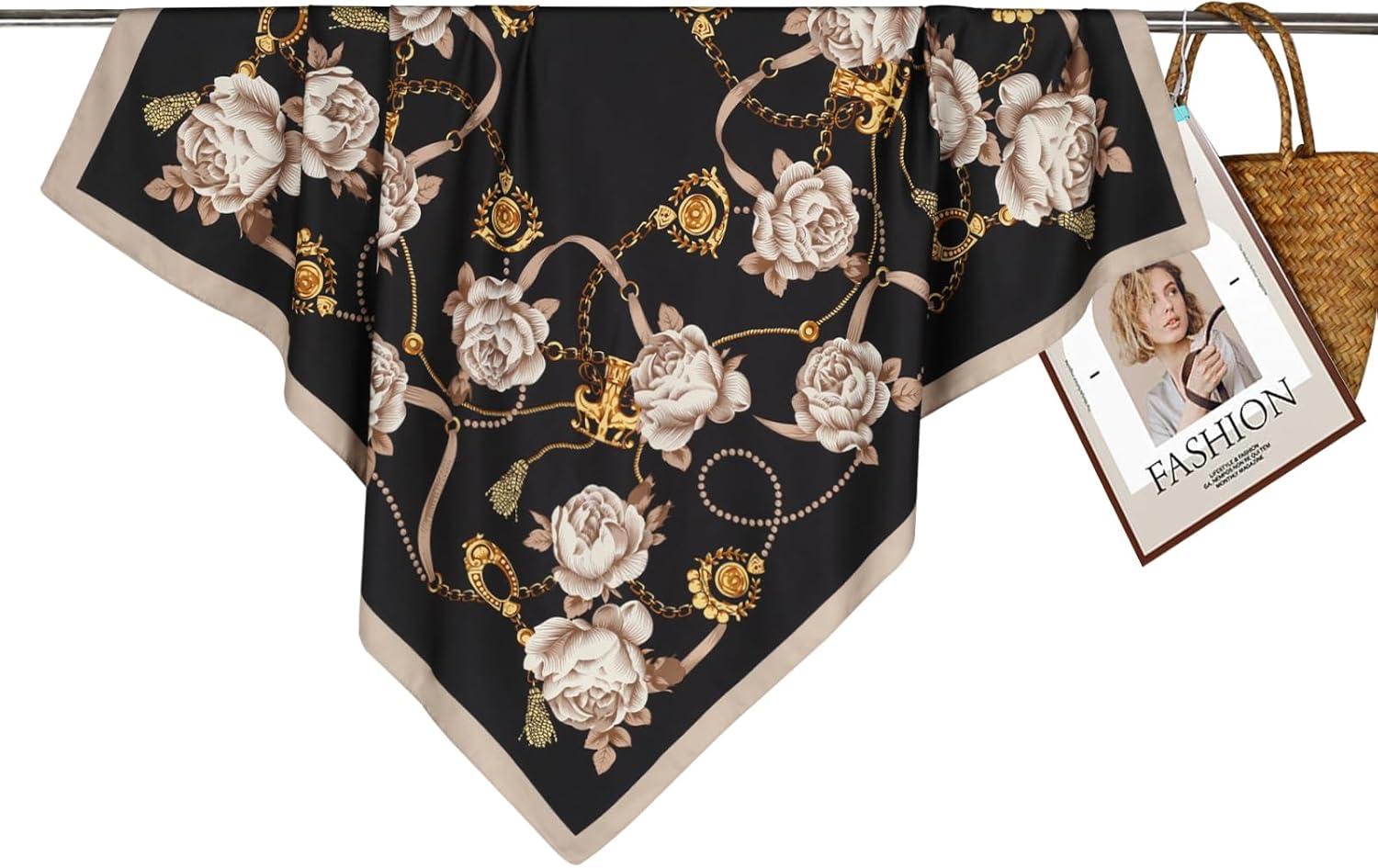 EXTREE Women's 35 inch Fashion Headscarf Silk Satin Scarf for Hair Wrapping at Night Bandana Square Scarf for Sleeping(Champagne Rose on Black Background)