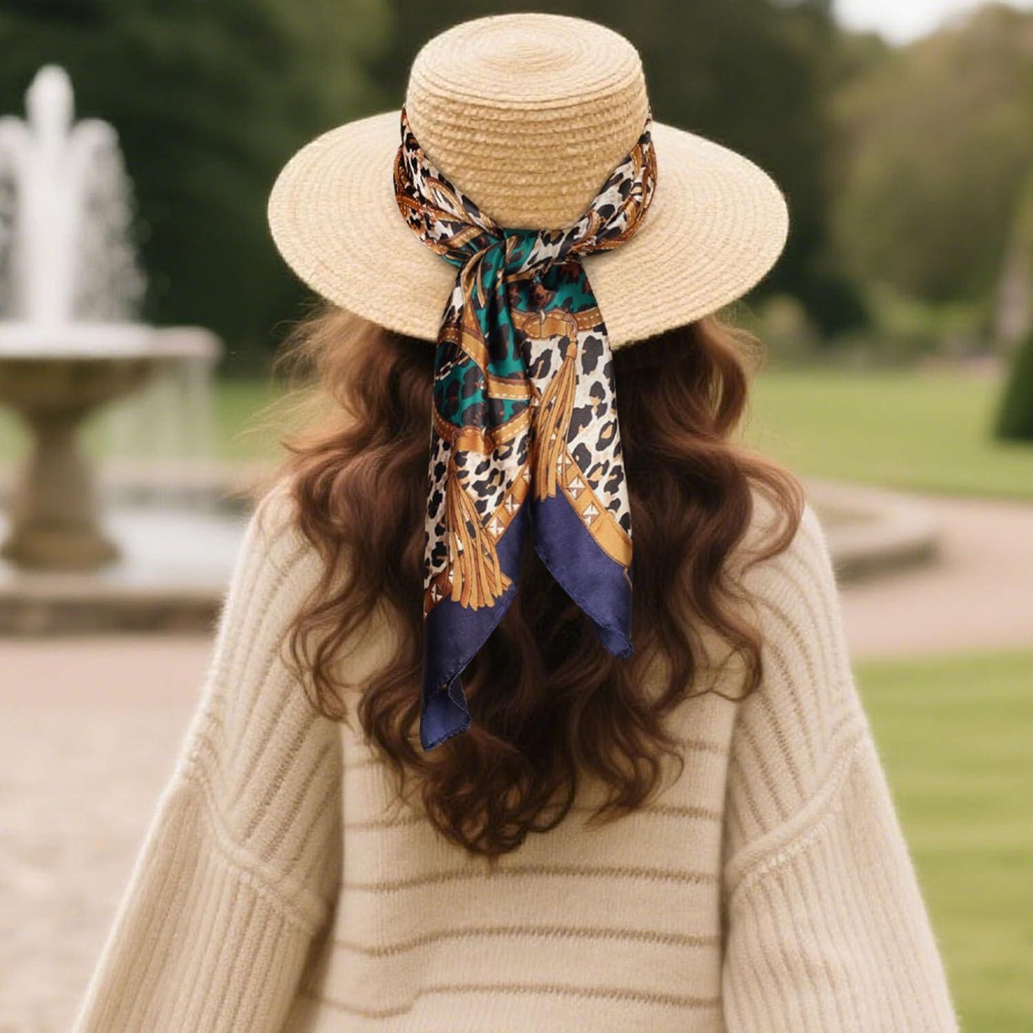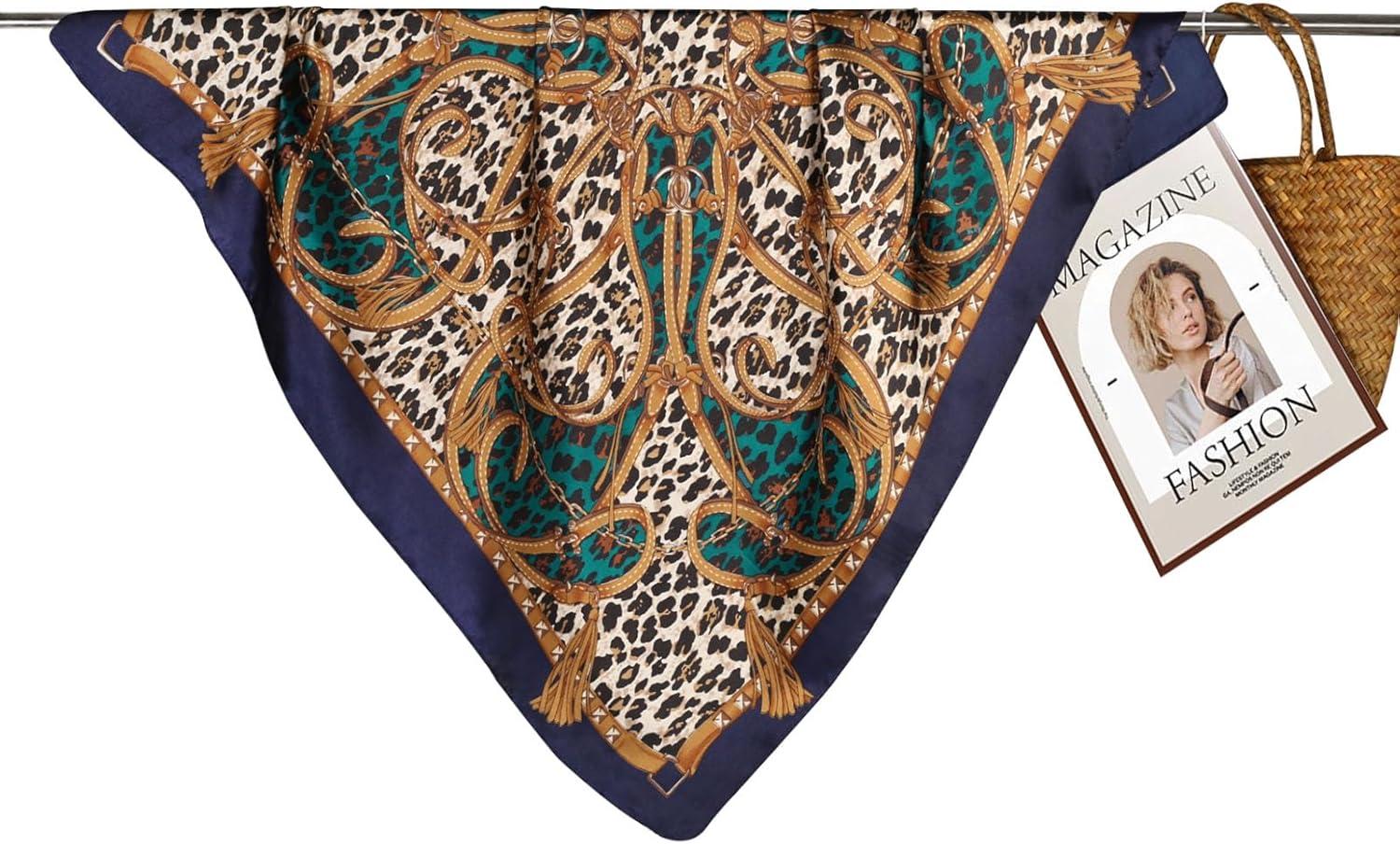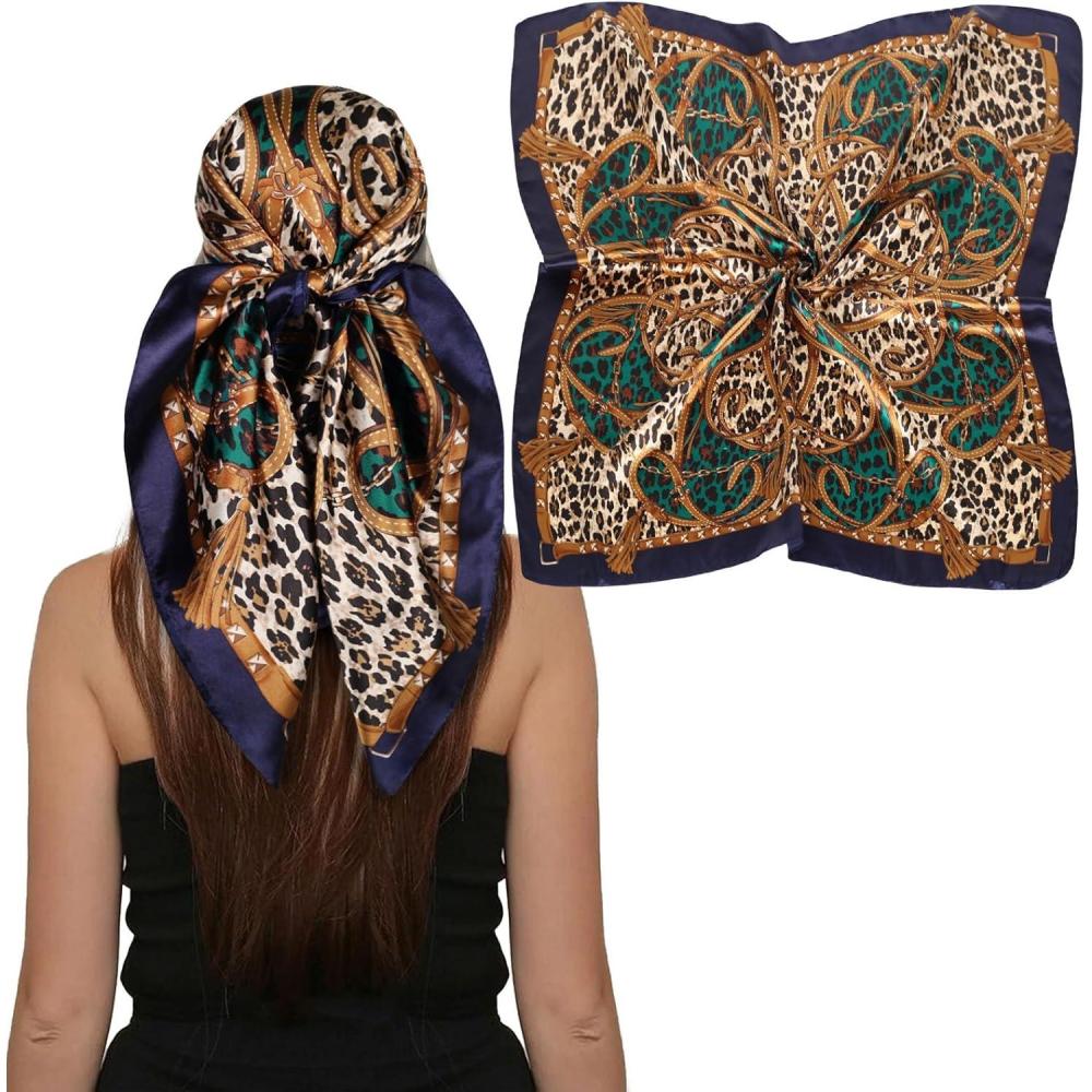 EXTREE Women’s 35 inch Fashion Headscarf Silk Satin Scarf for Hair Wrapping at Night Bandana Square Scarf for Sleeping(Leopard Tassel Dark Green)